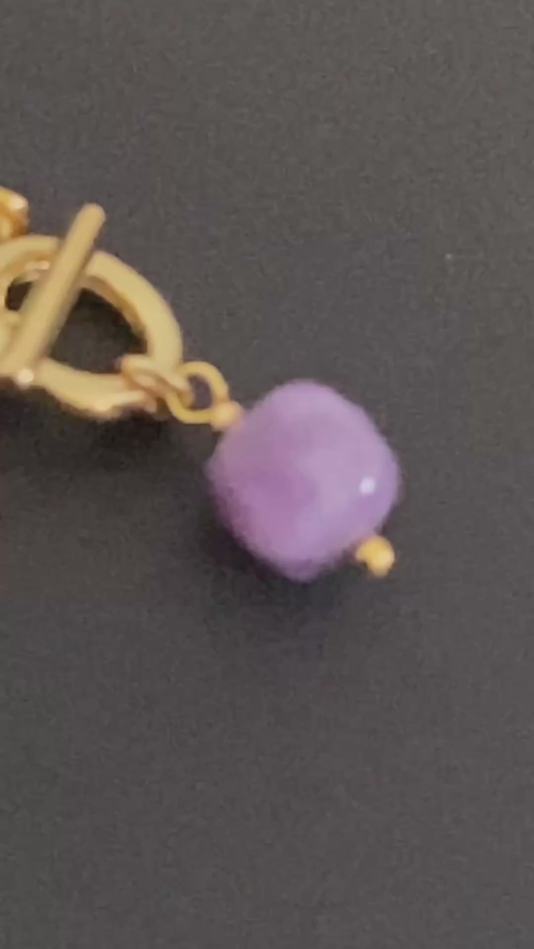 A gleaming 18k gold-plated toggle clasp serves as both closure and focal point, from which a faceted amethyst cube charm delicately hangs, adding a rich pop of colour and a touch of sophistication.