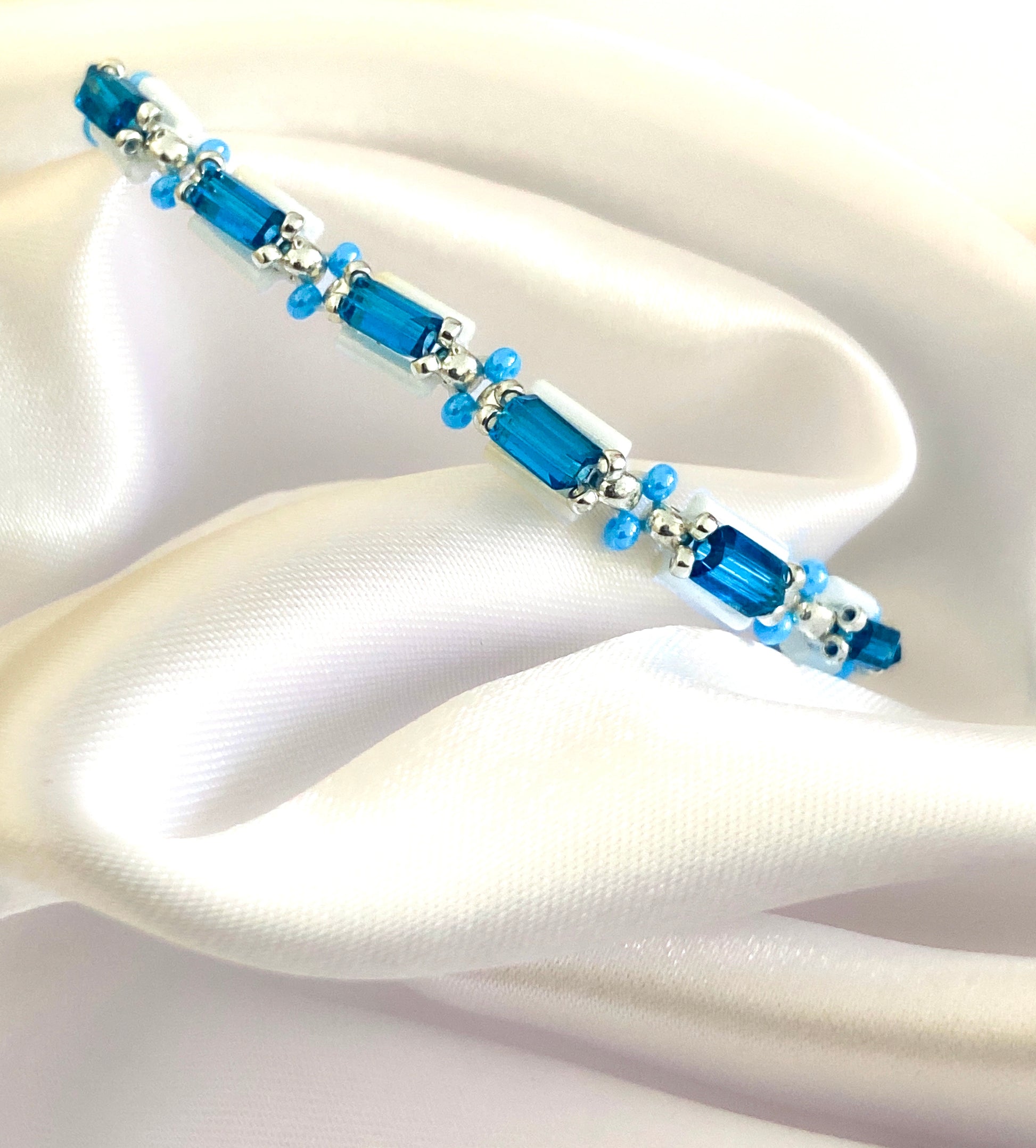 Elevate your style with the understated elegance of the Chic Block Bracelet. This sleek, linear design features a refined sequence of cuboid blue crystal beads, each faceted to catch the light like miniature glass bricks. Accented with pearlised cream and silver-toned beads, the bracelet exudes a modern yet timeless charm. Hand-stitched with precision, the geometric alignment evokes the elegance of a crystal train which is clean, structured, and effortlessly chic. Perfect for day-to-night wear, it’s a statement of quiet sophistication.