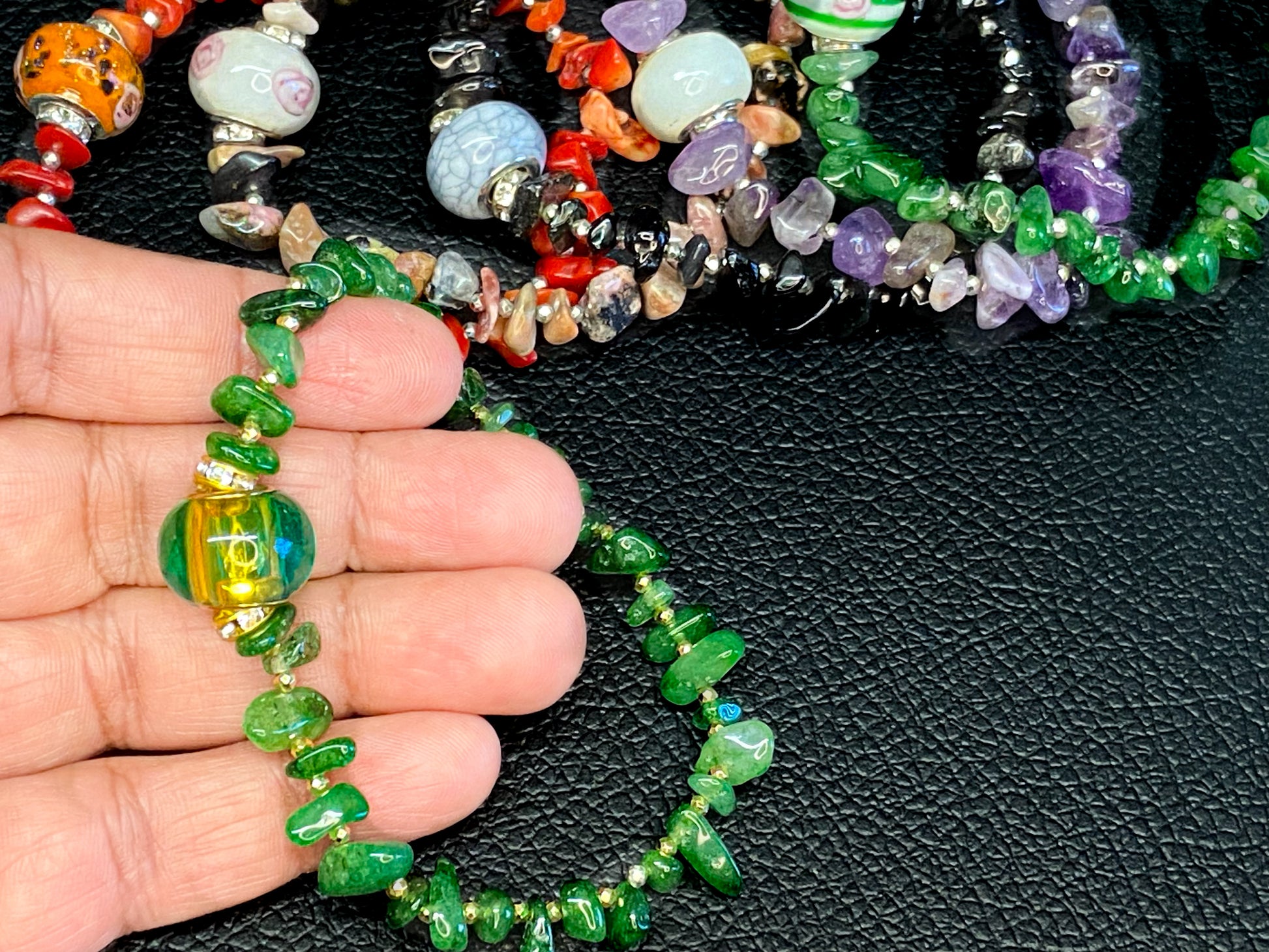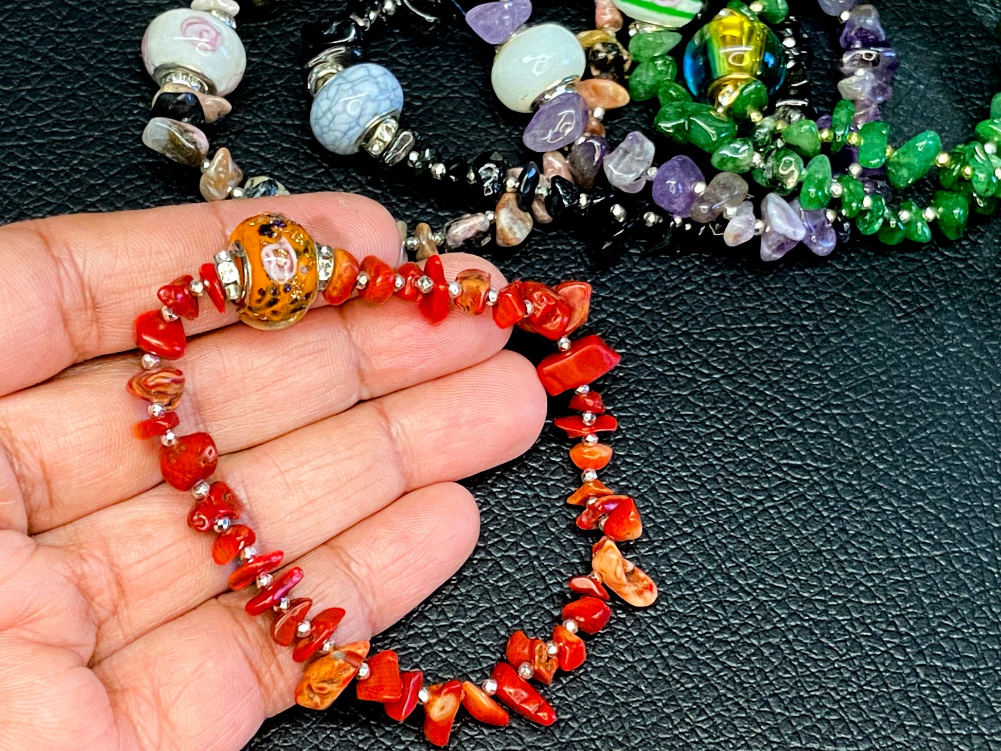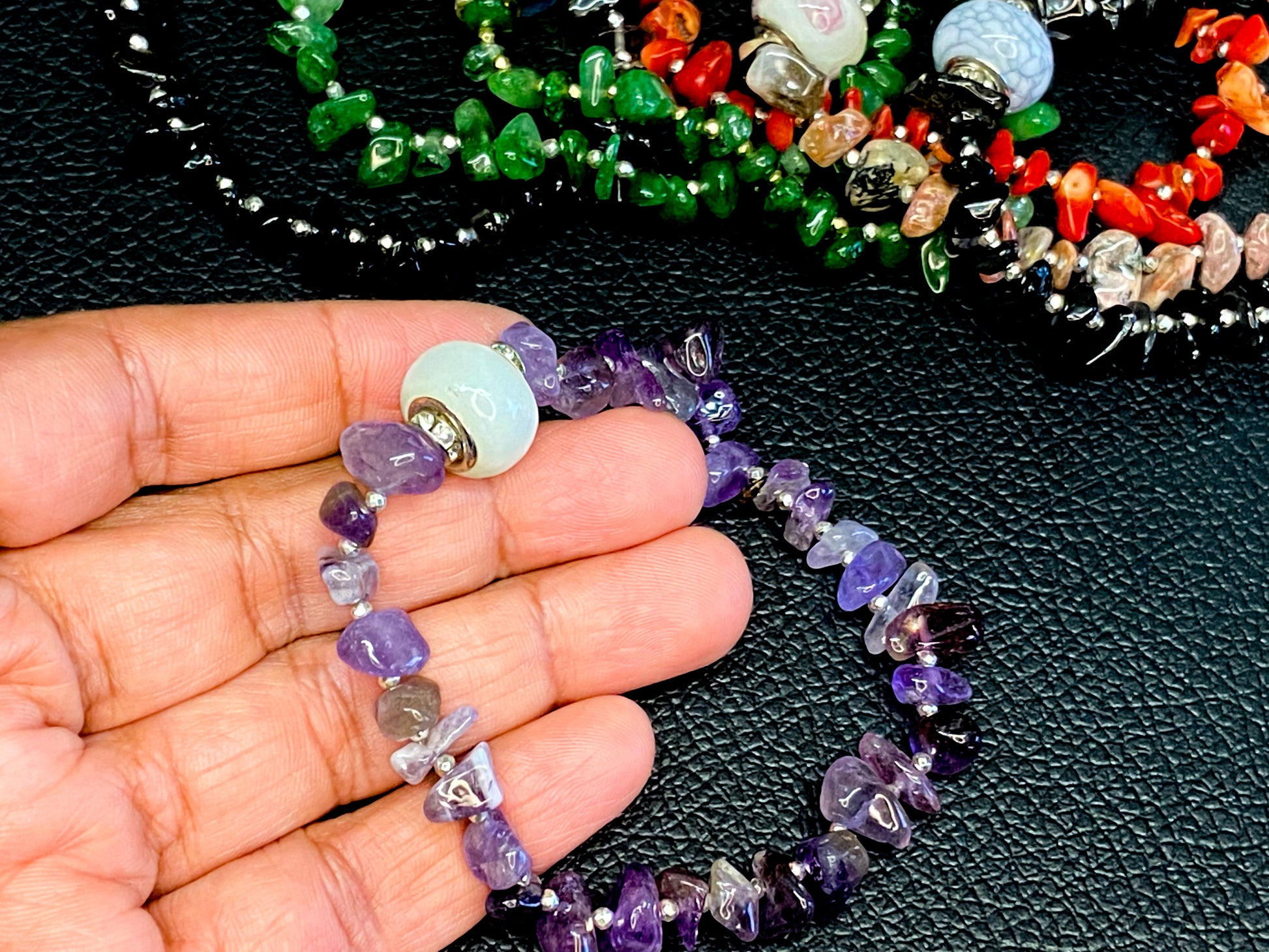This gemstone chip bracelet features an artful arrangement of irregularly shaped stones, creating a harmonious and modern design. A handmade glass bead serves as the focal point, adding a unique touch. The stretch design ensures a comfortable and easy fit. Available in various styles to suit your preference.