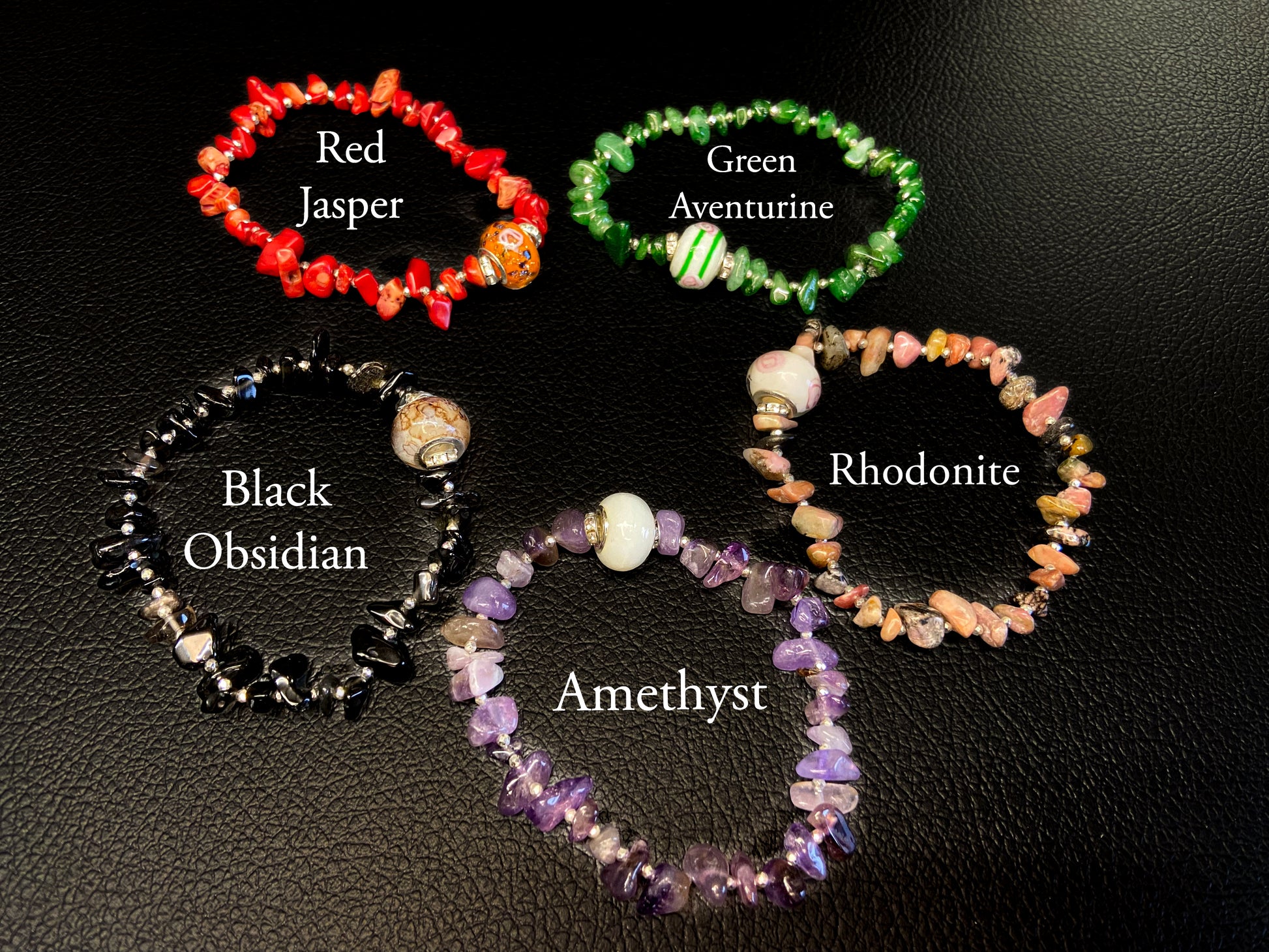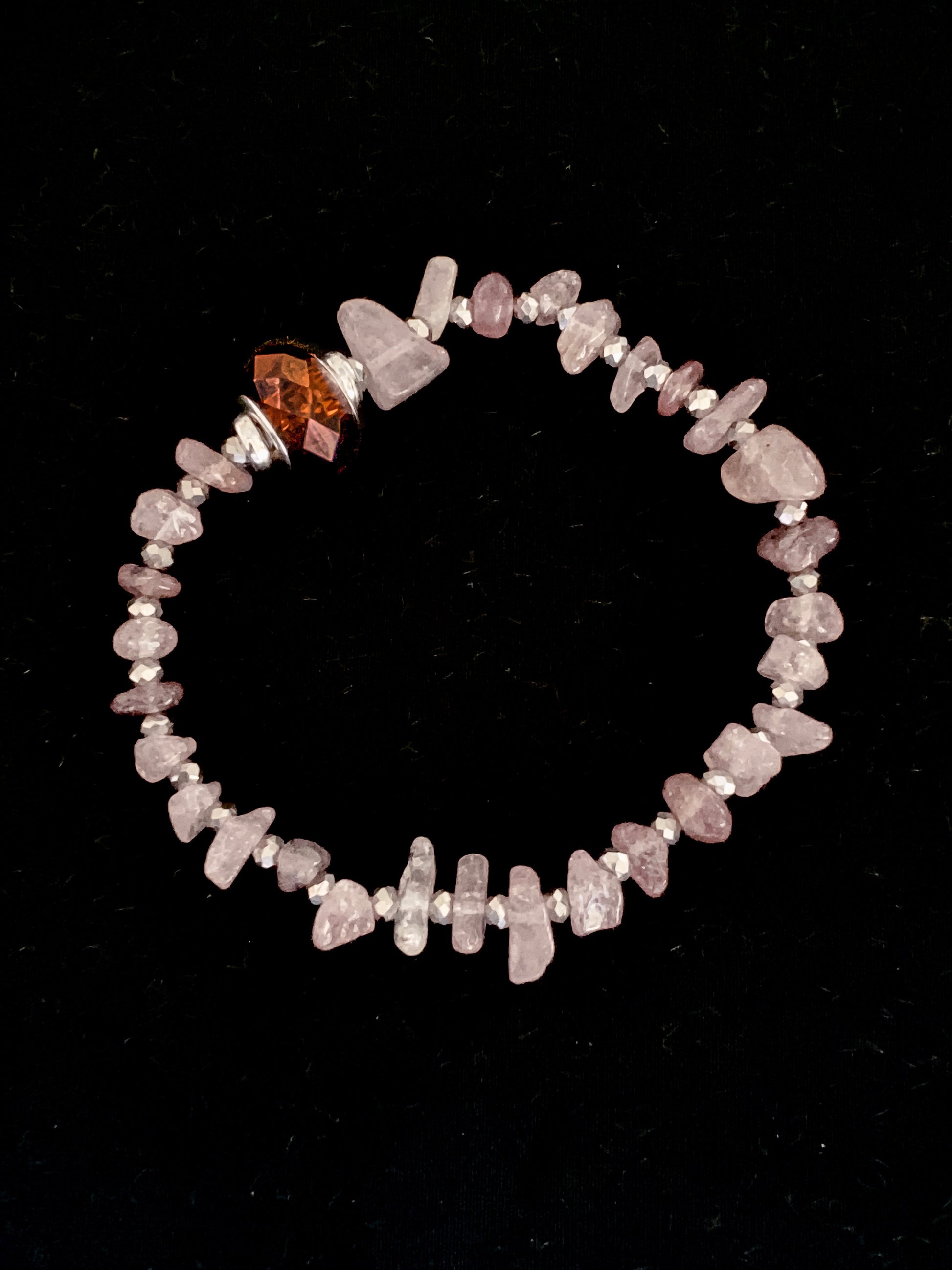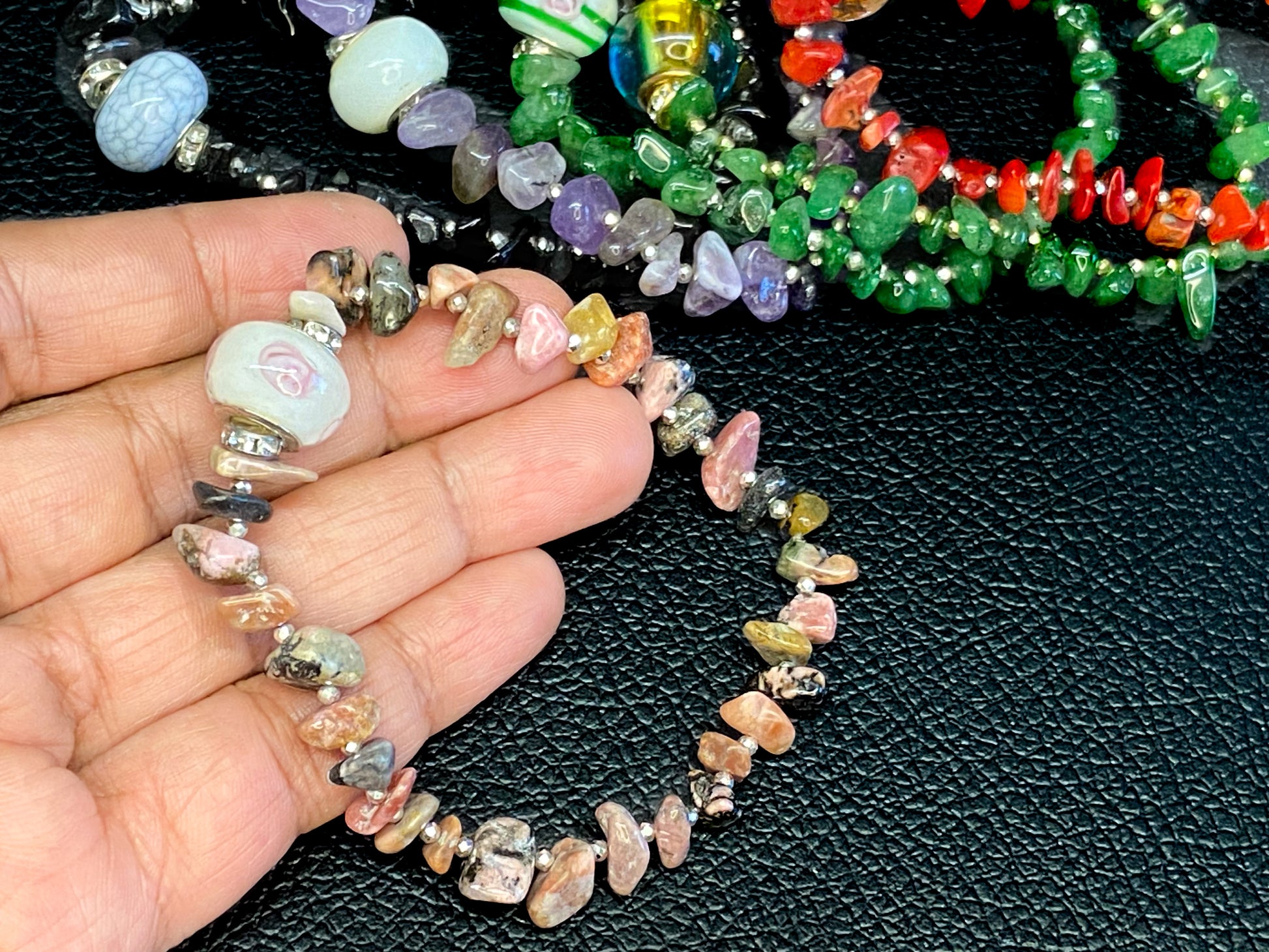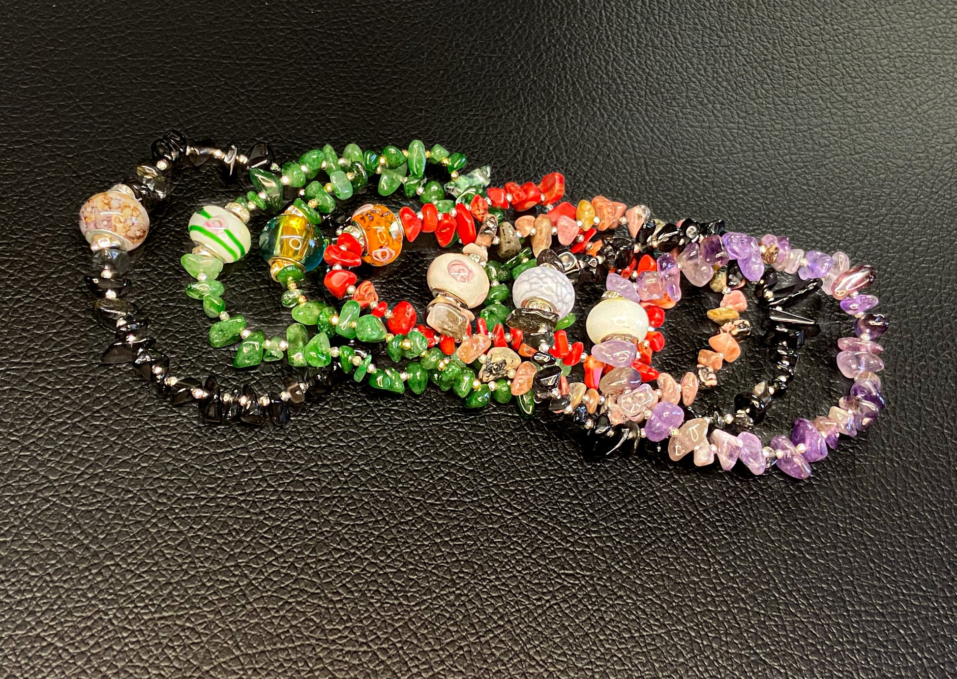 This gemstone chip bracelet features an artful arrangement of irregularly shaped stones, creating a harmonious and modern design. A handmade glass bead serves as the focal point, adding a unique touch. The stretch design ensures a comfortable and easy fit. Available in various styles to suit your preference.